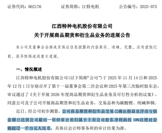 近日,江特电机关于开展商品期货和衍生品业务的最新进展公告显示,经公司初步测算,公司商品期货和衍生品交易已确认损益及浮亏金额达到公司最近一年经审计的归母净利润的10%,且绝对金额超过1000万元。