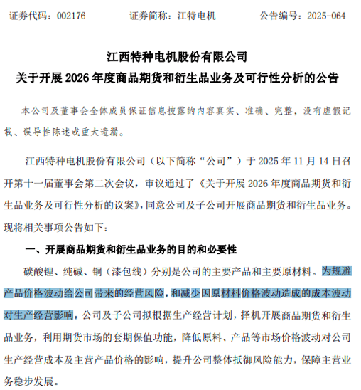 回溯公告,江特电机于2025年11月14日和2025年12月1日分别召开了第十一届董事会第二次会议和2025年第三次临时股东会,审议通过了《关于开展2026年度商品期货和衍生品业务及可行性分析的议案》,同意公司及子公司开展商品期货和衍生品业务。