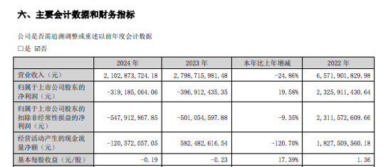 近年来,受锂产品价格大幅波动等因素影响,江特电机经营业绩2023年出现大幅下滑后持续承压。财务数据显示,2023年、2024年,公司分别实现营收27.99亿元、21.03亿元;归母净利润-3.97亿元、-3.19亿元;扣非净利润-5.01亿元、-5.48亿元。