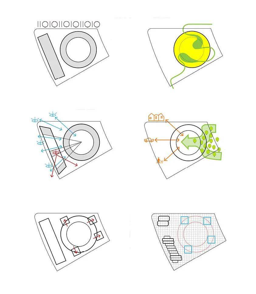 建筑形态通过退台、错动等手法,弱化了体量的厚重感,营造出轻盈舒展的视觉印象。通过覆土配套功能营造“绿色岛屿”山丘,与漂浮其上的清晰玻璃体量形成刚柔对比,既创造出无柱大空间及多尺度公共场景,也自然区分出公共与私密的不同空间节奏。环绕圆楼的内外景观,随弧线延展,为园区注入持续的生命力。
