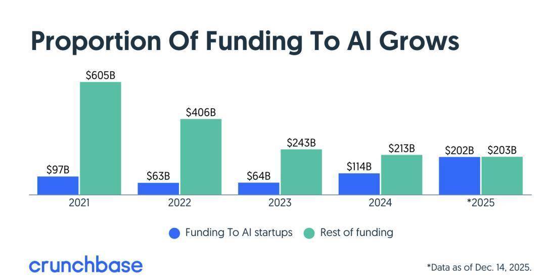 据Crunchbase数据,今年投资者向AI领域投入了超过2023亿美元,其中约50%流向初创公司,比2024年增长了16%。