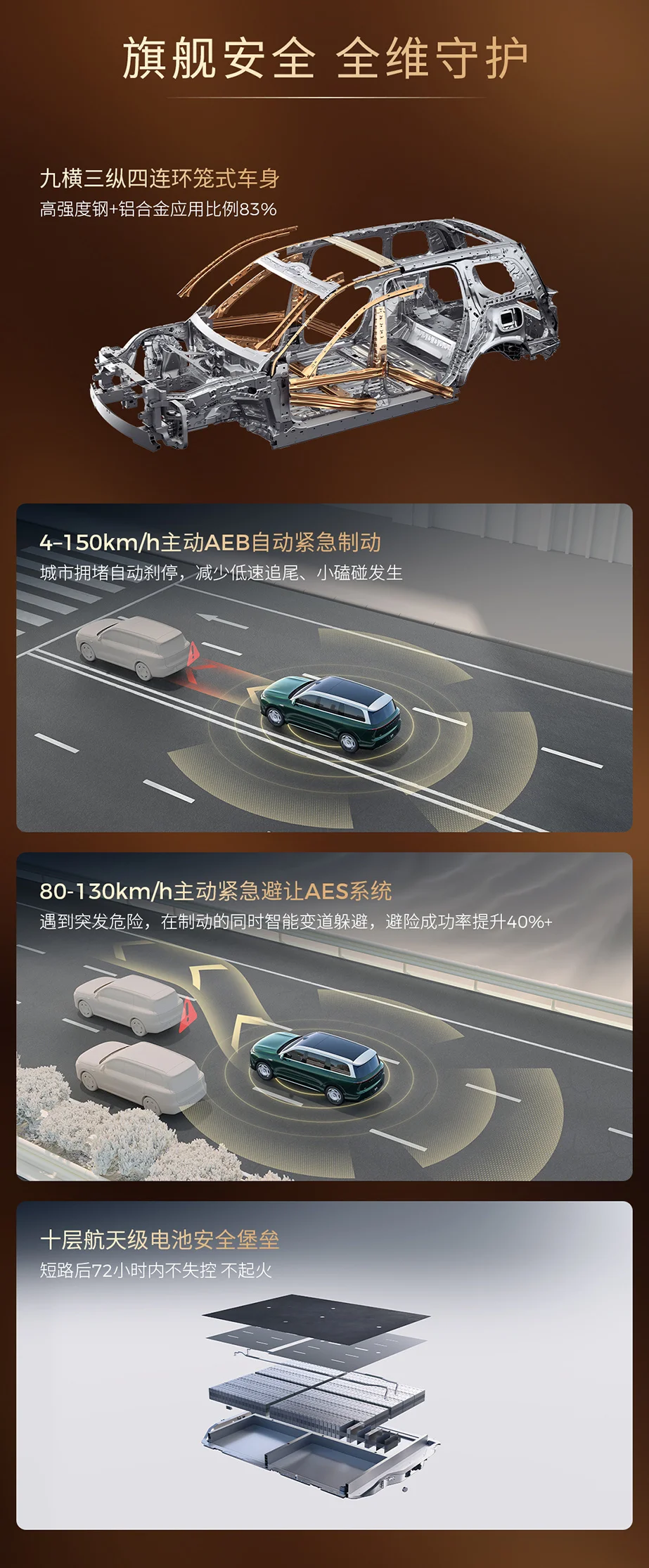 新车提供 6 座 / 7 座可选;搭载双 8797 芯片、80.3kWh 超大增程专属电池(宁德时代超混电芯)、车规级森野氧舱、电动开合冷暖冰箱、12 层奢享级座椅、二排右侧真零重力座椅、三排超大空间贵宾座。