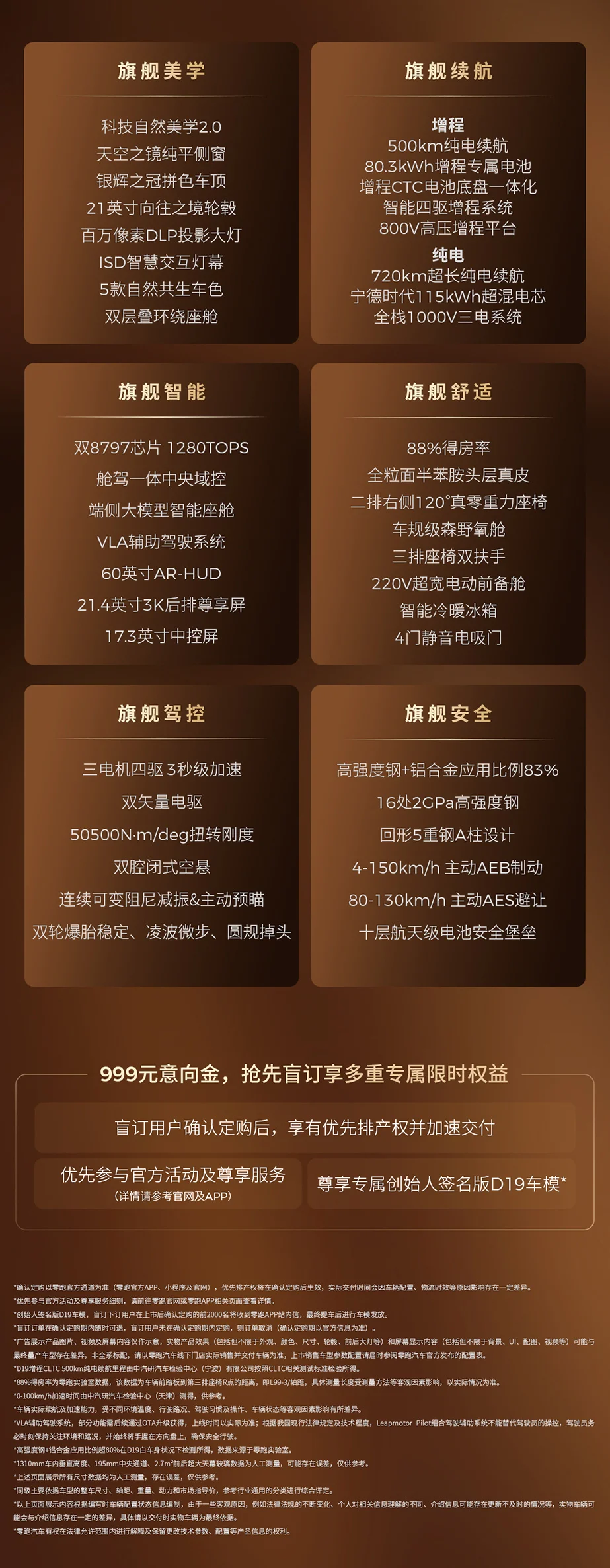 零跑 D19 已于 11 月 1 日正式开启盲订,支付 999 元意向金可享优先排产、限量 2000 份创始人签名 D19 车模及后续活动优先参与权 + 尊享服务在内的多项权益。