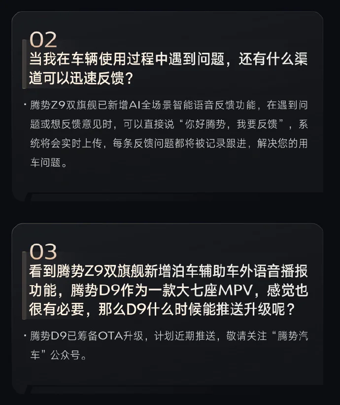 此外,官方还宣布,腾势Z9双旗舰已新增AI全场景智能语音反馈功能,在遇到问题或想反馈意见时,可以直接说“你好腾势,我要反馈”,系统将会实时上传,每条反馈问题都将被记录跟进,解决车主用车问题。