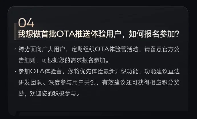 12月29日,腾势汽车官方宣布,腾势D9已筹备OTA升级,计划近期推送泊车辅助车外语音播报功能。官方提醒,腾势会定期组织OTA体验营活动,请留意官方公告细则,可根据需求报名参加。