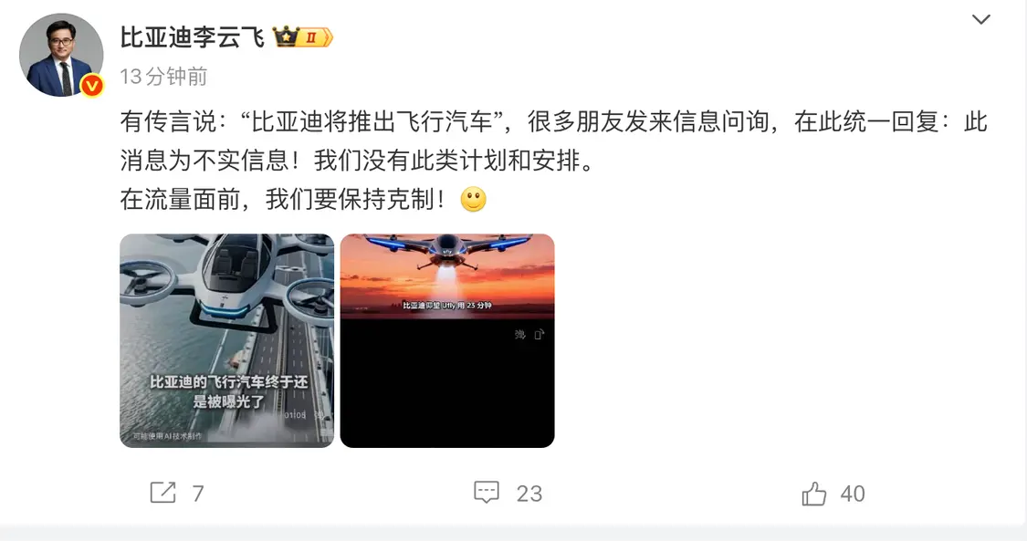 12月29日,比亚迪集团-品牌及公关处总经理李云飞发文回应了“比亚迪将推出飞行汽车”的传言,称此消息为不实信息,没有此类计划和安排。他还称,在流量面前,我们要保持克制。
