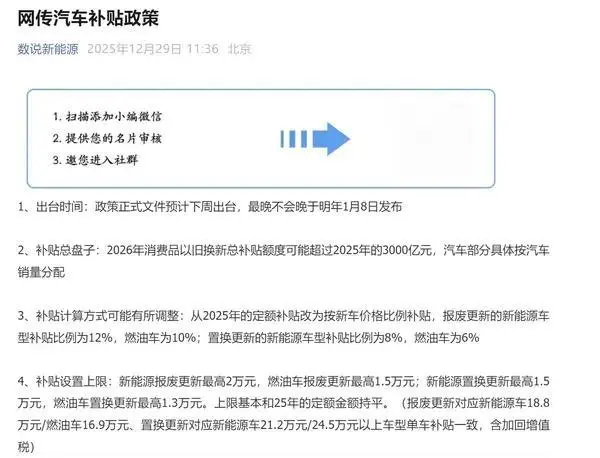 2025年即将结束。近日,CNMO注意到,“数说新能源”发文,对网传的2026年汽车补贴政策进行了整理和汇总。