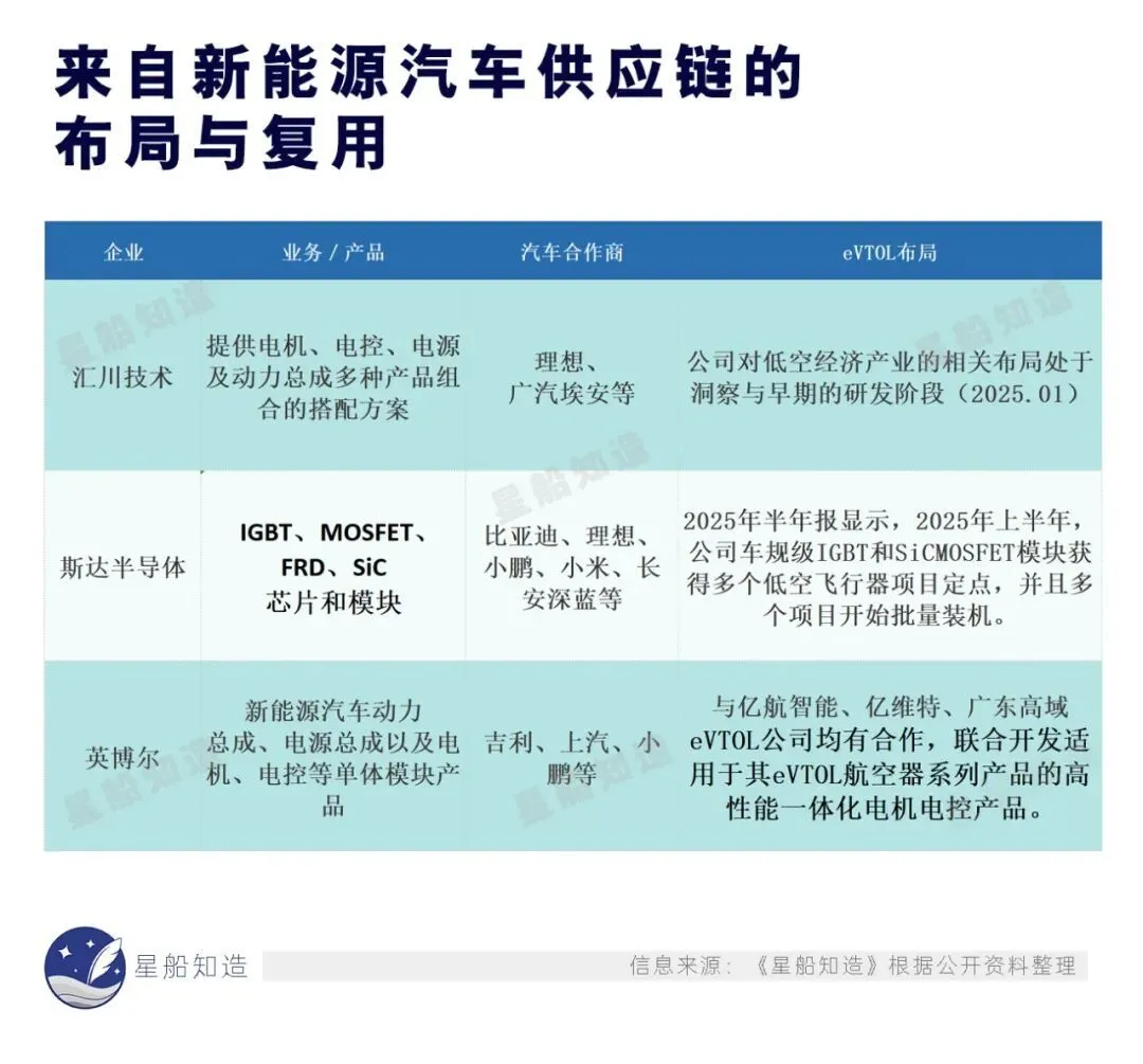 汇川技术、英搏尔、斯达半导体等企业,原本深耕于新能源车的电驱与功率电子模块,如今也陆续获得多个eVTOL项目定点,部分型号已进入批量装机阶段。