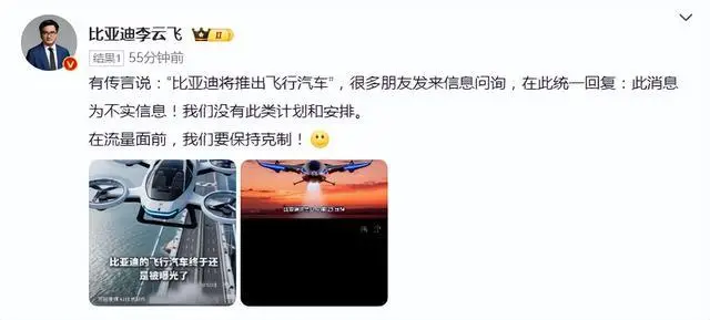 今天比亚迪集团品牌及公关处总经理李云飞发文明确说:“此消息为不实信息!我们没有此类计划和安排。” 后面还补了一句:“在流量面前,我们要保持克制。”
