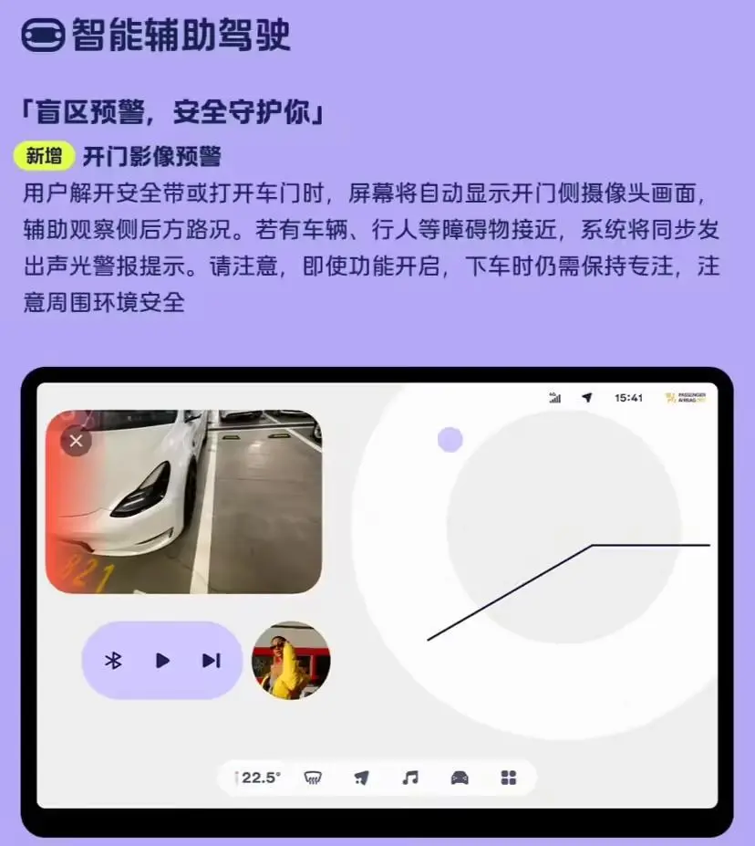 用户解开安全带或打开车门时,屏幕将自动显示开门侧摄像头画面,辅助观察侧后方路况。若有车辆、行人等障碍物接近,系统将同步发出声光警报提示。