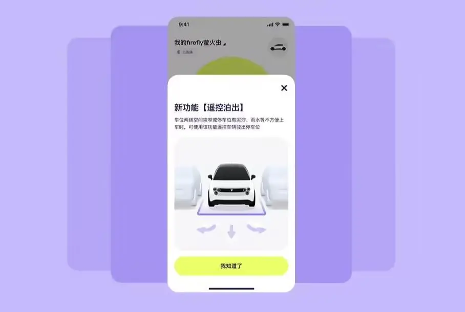 当车位空间狭窄或环境不便上车时,用户可通过 firefly 萤火虫 App 在车辆附近遥控车辆驶出车位。可在手机 App 上选择直行、左拐或右拐路线,车辆泊出停稳后即可上车。