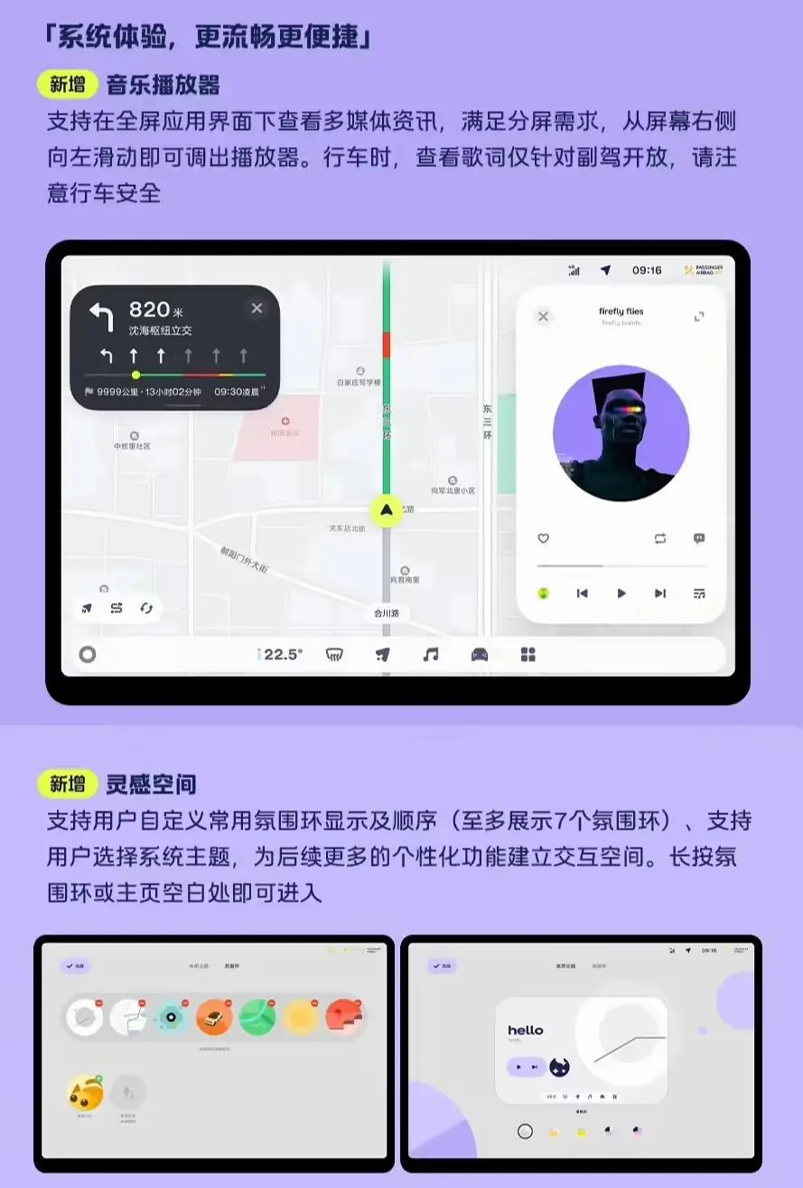 新增 lumo 随动:开启该功能后,lumo 将联动氛围灯,针对主驾与副驾唤醒 lumo 时,氛围灯将会根据双音区灵活移动并进行实时的氛围渲染,给予用户唤醒提示