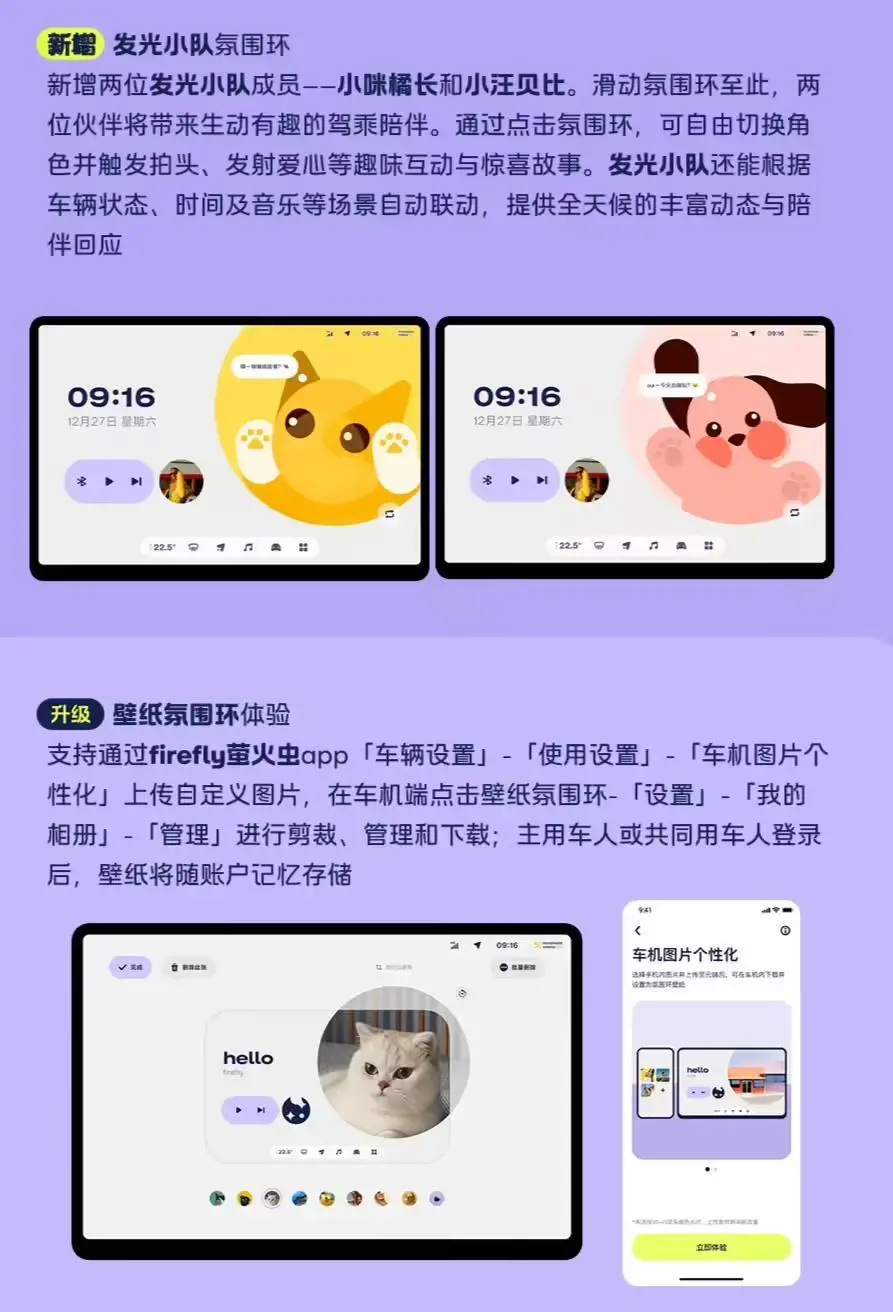 体验支持通过 firefly 萤火虫 App「车辆设置」-「使用设置」-「车机图片个性化」上传自定义图片,在车机端点击壁纸氛围环-「设置」-「我的相册」~「管理」进行剪裁、管理和下载;主用车人或共同用车人登录后,壁纸将随账户记忆存储。