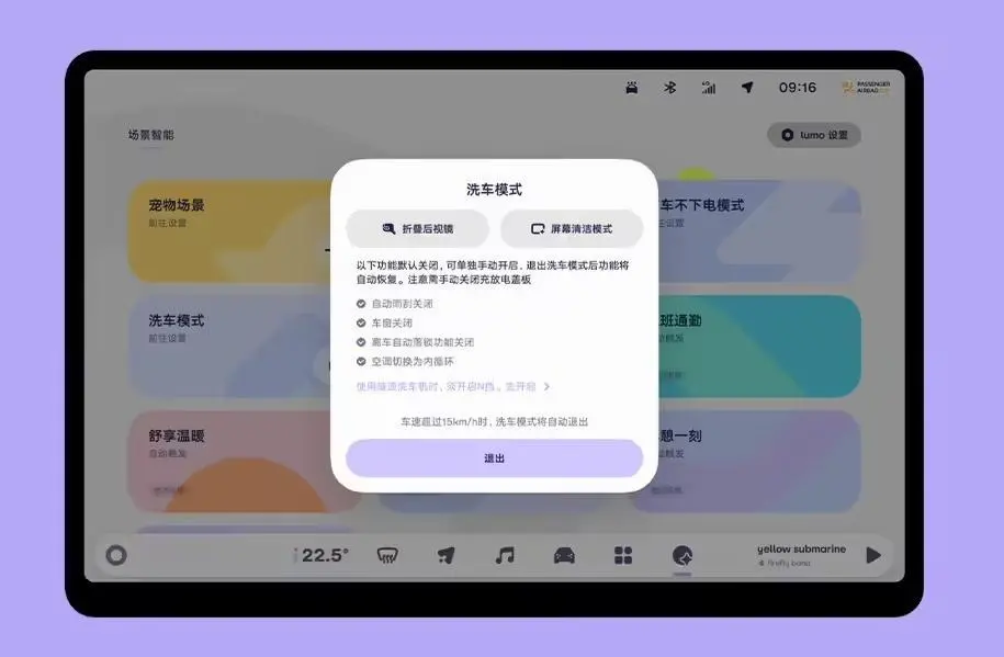 在洗车场景,选择进入洗车模式,车窗、自动雨刮、离车自动落锁功能将关闭,空调切换为内循环。以上各功能设定在洗车过程中可手动更改; 退出洗车模式后,功能将自动恢复。