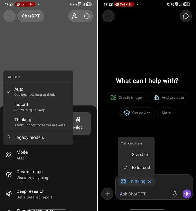 安卓版 ChatGPT 的思考功能此前被强制锁定在“标准”模式,该模式虽然响应较快,但因算力调用受限,难以进行长时间的深度推理。此次更新后,移动端用户将获得与桌面端一致的体验,能够根据需求灵活调整模型的思考深度。