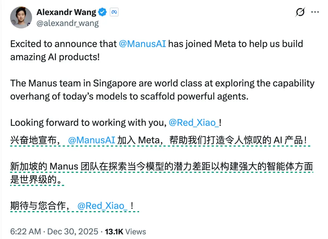 不知道等团队开始一起工作过后,两人将是什么样的汇报线关系。收购完成后,Manus创始人肖弘将出任Meta副总裁。