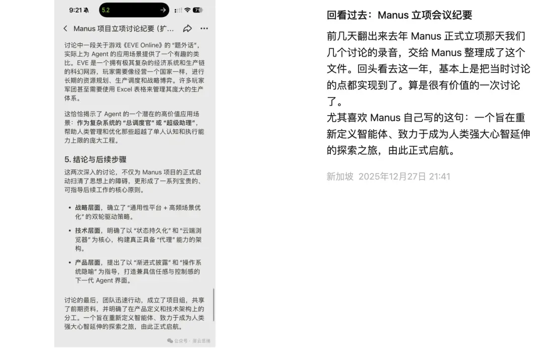就在此次收购前夕,Manus官方发布的一篇公众号文章《回看过去:Manus 立项会议纪要》在朋友圈小规模刷屏。