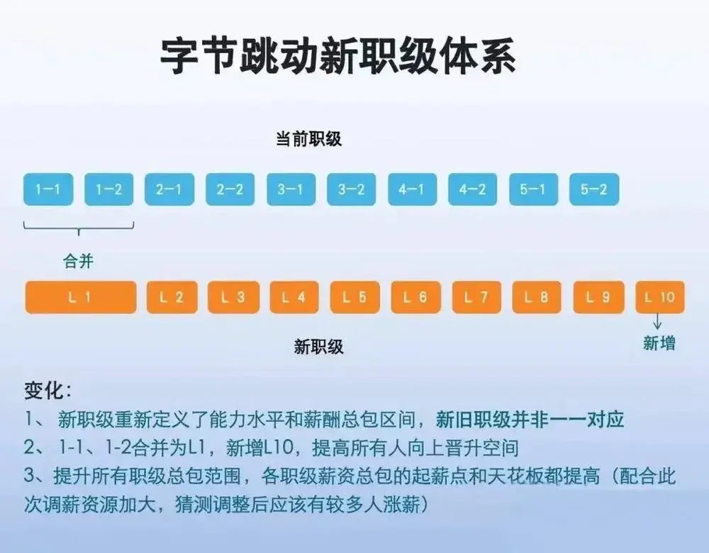 近期宣布全员涨薪的字节,也将原有的5级10档职级体系扩展为10级体系,希望能够解决“人才通胀”,为员工提供了更广阔的涨薪空间。