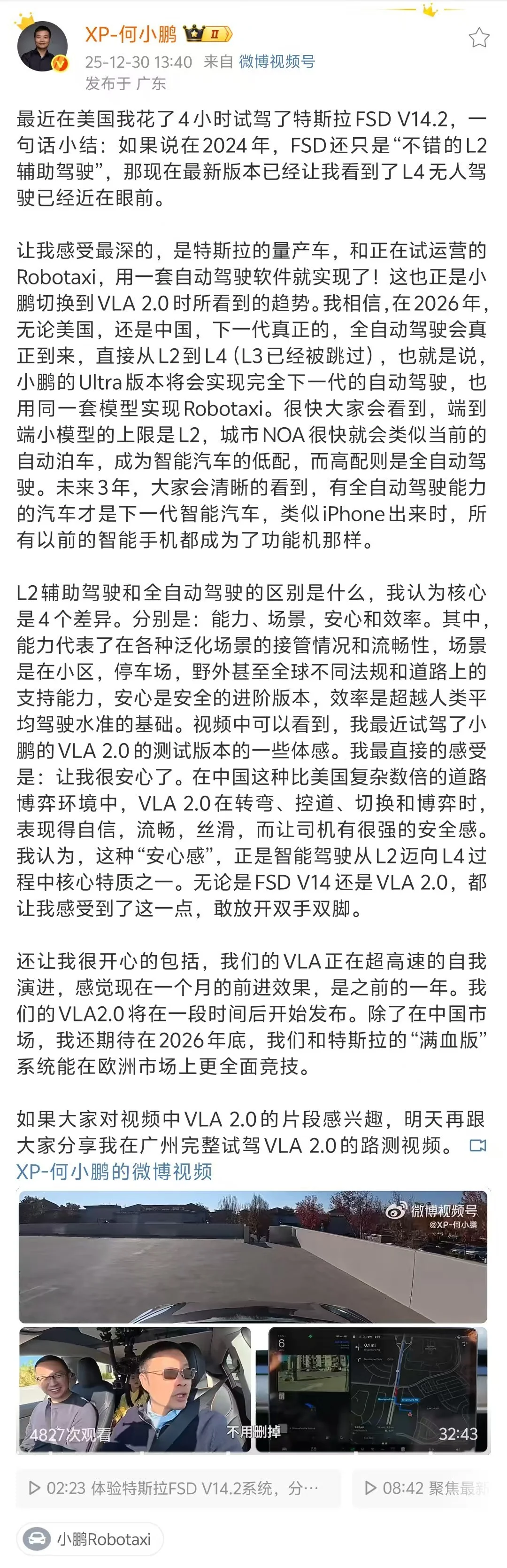 12月30日,何小鹏在个人微博发布在美国体验特斯拉FSD的视频。何小鹏表示,去年FSD还只是“不错的L2辅助驾驶”,而最新版本已经让他看到L4无人驾驶近在眼前。何小鹏邀请马斯克在2026年底,和特斯拉的“满血版”系统在欧洲市场上全面竞技。何小鹏还预言,明年无论美国还是中国,全自动驾驶会真正到来,直接从L2到L4。