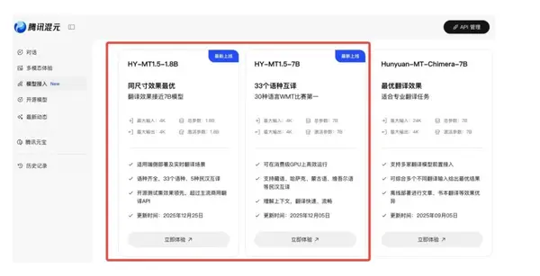 12月30日,腾讯官方宣布开源其混元翻译模型1.5版本,包含Tencent-HY-MT1.5-1.8B和Tencent-HY-MT1.5-7B两款模型,支持33种国际语言互译及5种民汉/方言翻译,覆盖捷克语、马拉地语、爱沙尼亚语、冰岛语等小语种。两个模型已在腾讯混元官网、GitHub及HuggingFace平台上线,供开发者免费下载使用。