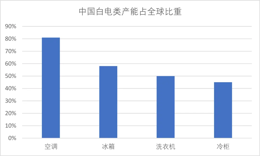 随着国内冰洗渗透率触及天花板,空调量增空间也不大,行业本就产能过剩问题将日益凸显。以白电为例,中国绝大部分产能都占到全球的5成以上,空调甚至占到8成,再考虑到过去10年国内企业在海外的资本开支,过剩只会更严重。