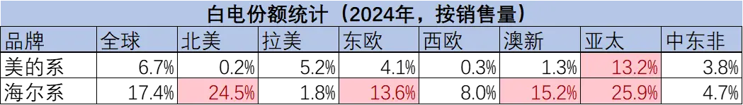 2024年,美的和海尔的家电业务收入均在2700亿元左右,也就意味着在全球份额都仅6%左右。由于美的外销比例低于海尔,且外销中代工占比较多,所以实际上,在白电领域,美的自有品牌在海外的份额仅3%左右。