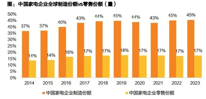 但三十年过去,早期的偏简单的增长模式将难以为继,最直观体现在数据上就是,中国家电企业全球制造份额与零售份额的百分比之差,并未缩小。