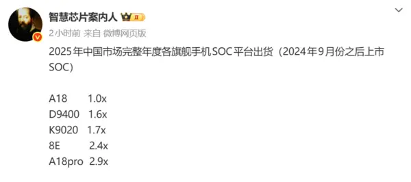 1月1日,数码博主“智慧芯片案内人”发布了2025年旗舰手机SOC国内出货量对比。其中,苹果A18 Pro以显著优势成为出货量最高的旗舰移动平台。