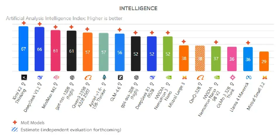 AI模型正在经历一场架构革命,打开Artificial Analysis排行榜就会发现,智能度排名前十的开源模型清一色都是MoE(Mixture of Experts,专家混合)推理模型。