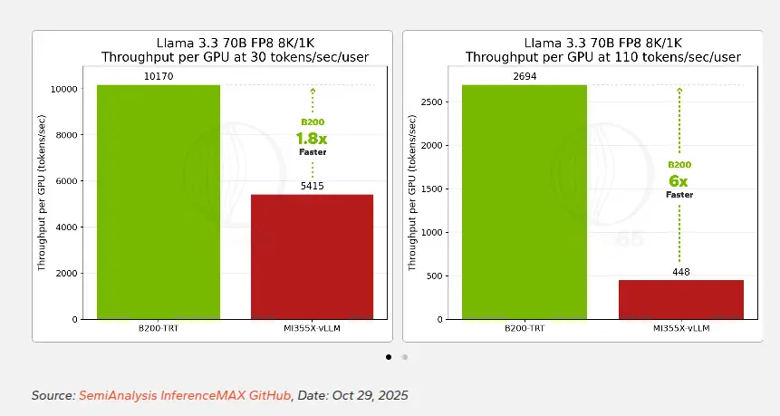 在基线交互性(30 tokens/sec/user)下,B200的性能约为MI355X的1.8倍;当交互性要求提升到110 tokens/sec/user时,这一差距扩大到6倍以上。