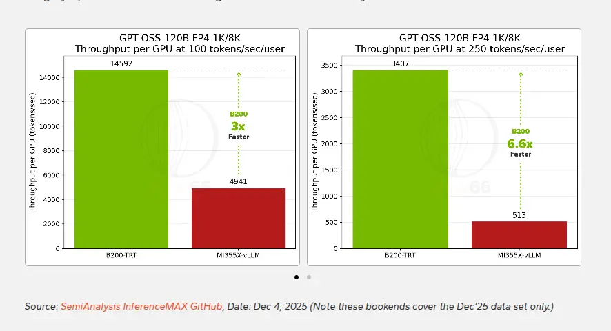 这款OpenAI开源模型拥有1170亿总参数,但每个token只激活约51亿参数。在2025年12月的测试数据中,100 tokens/sec/user交互性下B200的性能接近MI355X的3倍。