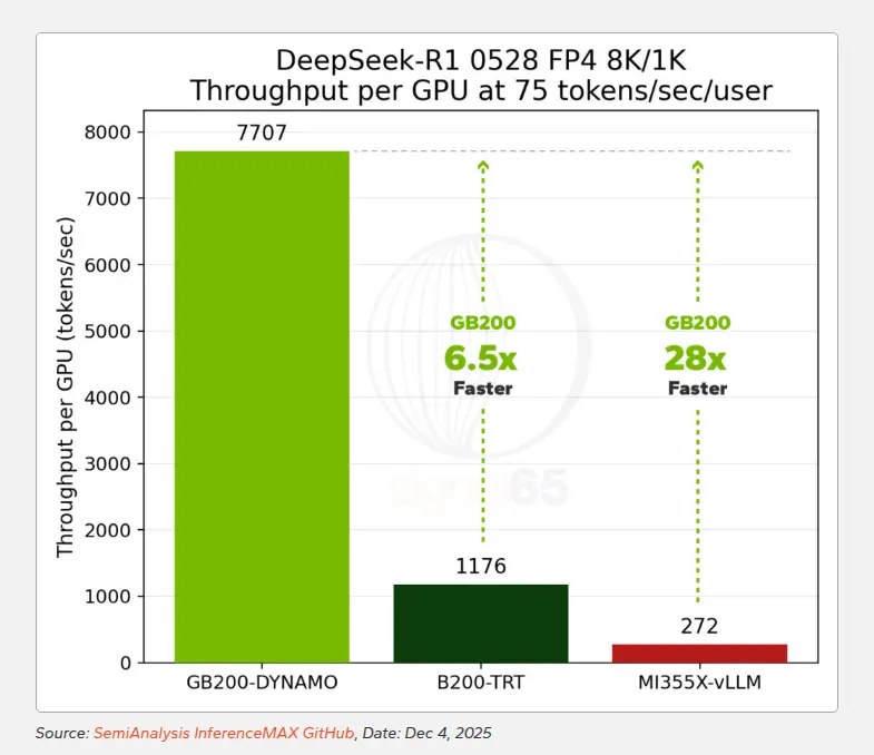 更关键的是,GB200 NVL72能够达到竞争平台根本无法企及的水平,在28卡配置下可以输出超过275 tokens/sec/user,而MI355X在相当吞吐水平下的峰值只有75 tokens/sec/user。
