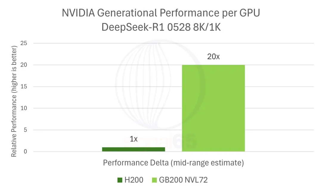 报告估算在DeepSeek-R1的典型工作负载下,GB200 NVL72相比H200的性能提升约20倍。