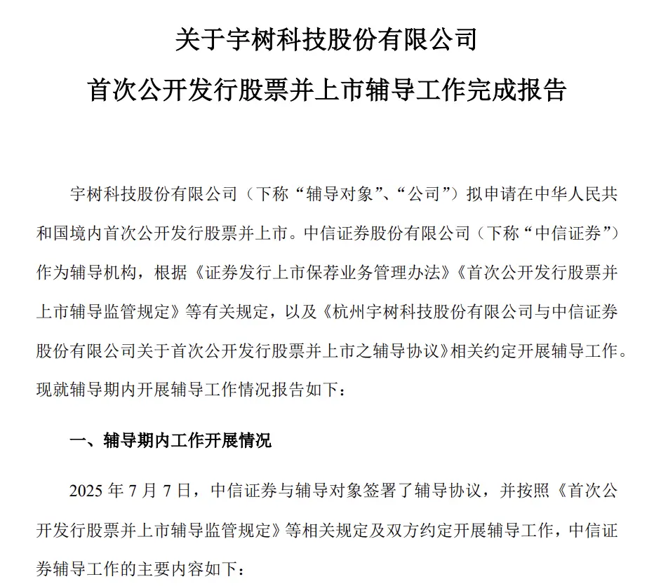 2025年7月,中国证监会官网消息,宇树科技于7月7日签署上市辅导备案报告,由中信证券担任辅导机构。