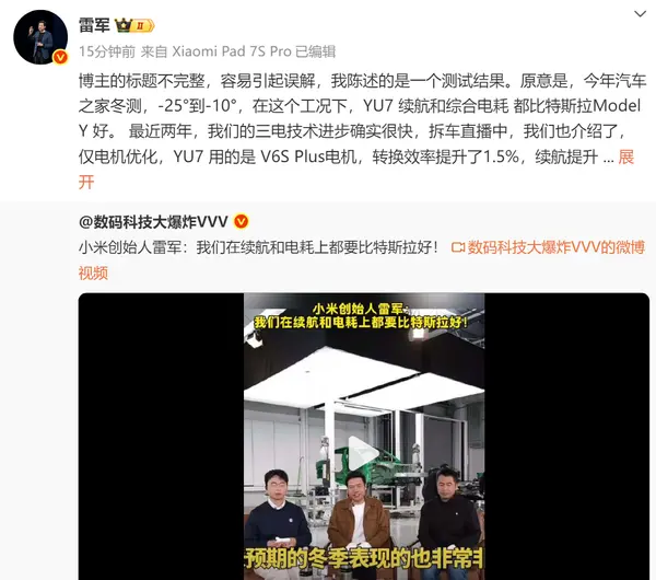 近日,一位数码博主发布视频,标题为“小米创始人雷军:我们在续航和电耗上都要比特斯拉好!”。雷军随后转发该视频并澄清,称原意被简化,易引发误解。他解释,其本意是指在汽车之家2025年冬季测试中,于零下25℃至零下10℃的严寒工况下,小米YU7的实测续航与综合电耗表现优于特斯拉Model Y。雷军强调,这是基于具体测试条件下的客观结果,并非泛指全场景超越。