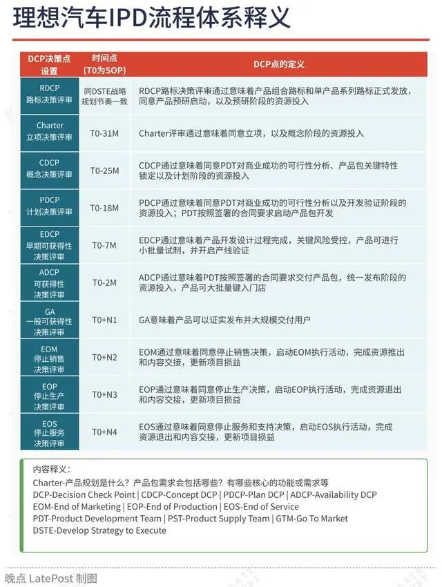 理想在 IPD 转型最彻底的 2023 年,构建的 IPD 流程体系,核心是从产品开发节奏出发,用阀点的方式控制整个流程的推进。其中产品管理委员会是产品决策的最高机构,产品操盘委员会是产品商业化的最高决策机构。在此基础上,分为路标工作组、车型 PDT、平台 PDT、供应 PST 以及销服 GTM 和财经。