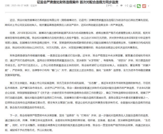此案中,于某、贺某提供控制或联络的多家公司配合越博动力开展虚假业务,构成共同违法,被分别拟罚款200万元、30万元。证监会明确表示,后续将综合运用直接立案处罚、移交主管部门处理、刑事移送等多种方式,全面追究配合造假方责任,破除造假利益链与“生态圈”。这也是证监会严肃查处财务造假案件,首次对配合造假方同步追责。