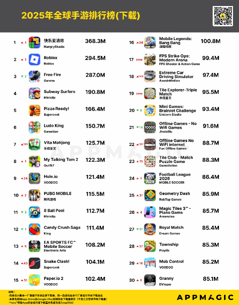 与收入榜的“中重度主导”不同,2025年全球手游下载Top30榜单显示,超半成游戏下载量破亿。其中超休闲游戏6款,休闲游戏16款,中重度游戏8款进入下载榜。