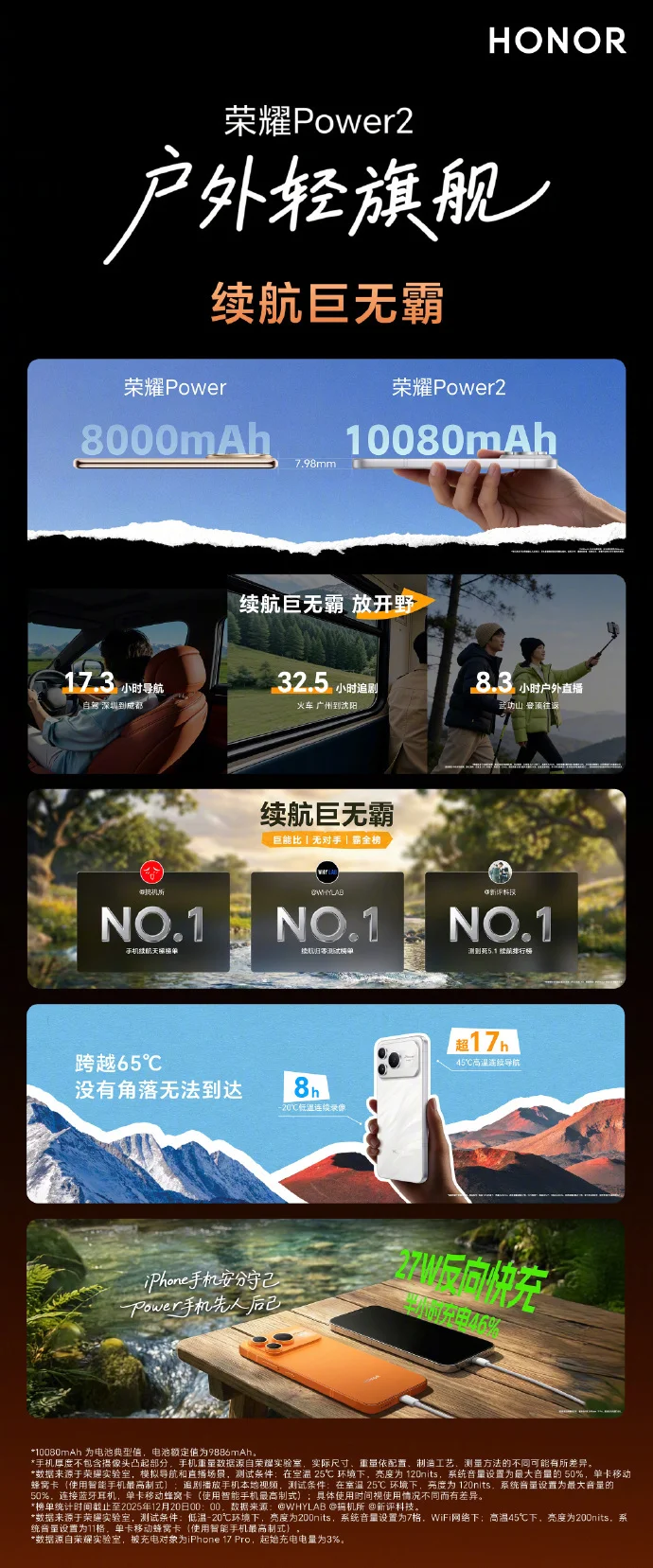新机厚度为7.98mm,内置大容量电池,并支持27W反向充电功能。官方称其可适应极寒与高温等极端环境。