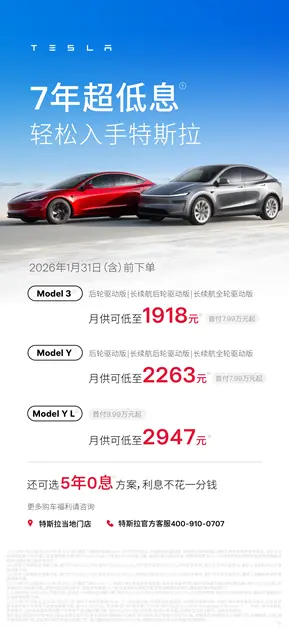 1月6日,特斯拉首次推出7年期超低息购车方案,涵盖Model 3、Model Y及Model Y L等多款车型,年化利率低于1%。其中Model 3首付7.99万元,月供可低至1918元;Model Y首付相同,月供最低2263元;Model Y L同步提供5年0息及7年超低息方案,后者月供可低至2947元。该限时政策将于1月31日截止。