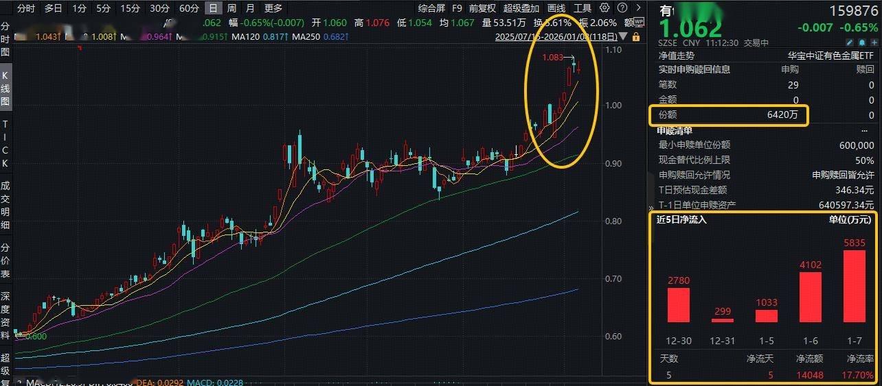 继昨日有色ETF华宝(159876)斩获日线5连涨,再创历史新高后,今日(1月8日)该ETF迎来5连涨后的首度回调,场内价格现跌0.65%,资金或视为“倒车接人”良机,积极进场抢筹!截至发稿,有色ETF华宝(159876)获资金实时净申购6420万份,此前5日连续获资金净流入,合计金额1.4亿元!