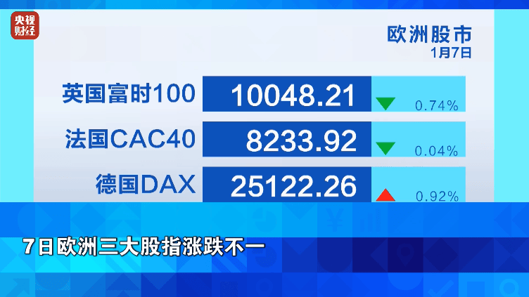 周三,欧洲三大股指涨跌不一,英国富时100指数较前一交易日下跌0.74%,不过仍然报收于1万点以上;法国CAC40指数下跌0.04%;德国DAX指数则是上涨0.92%。数据面上,欧盟统计局公布的初步数据显示,欧元区2025年12月通胀率为2.0%,低于11月份的2.1%。