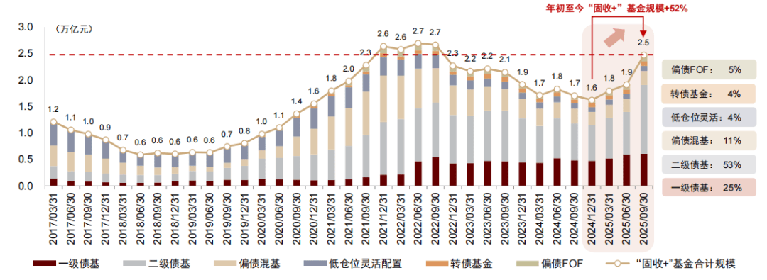 2)机构业绩刚性需求引发“抬仓位”与“抬波动”行为。以银行理财子和保险资金为代表的机构投资者,面临着刚性负债成本压力,在“资产荒”延续叠加利率中枢长期低位的背景下,传统纯债策略已经难以匹配其收益目标,此时机构资金需要被迫适度提升组合风险敞口和波动容忍度,从而换取收益增厚的可能性。从2025Q3的基金规模变化便可见一斑,二级债基这一机构主导型投资工具,短期内收获了大量的资金流入,这意味着“固收+”基金成为机构资金配置的新通道,未来或也将持续贡献大额资金增量。