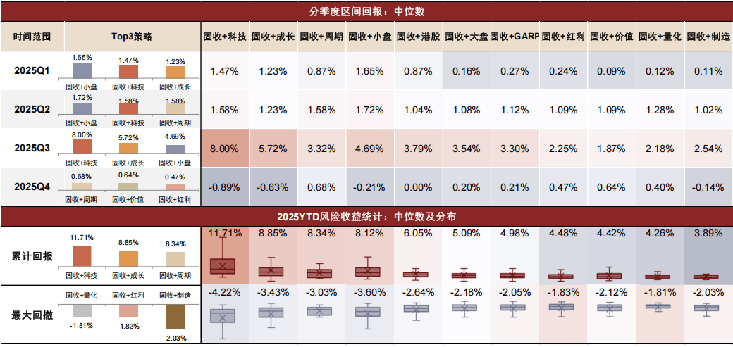 具体而言,2025年权益市场行情转暖,科技成长成为市场共识方向,“固收+科技”策略在Q1-Q3均上榜成为业绩Top3策略,值得关注的是,我们认为,AI投资等相关主题的行情逻辑有望延续至2026年,不过前期涨幅较大仍带来了一定的估值压力修复风险。此外,一方面是低利率下红利类资产性价比相对突出,另一方面是AI算力对于材料的需求推动有色行业表现强势,“固收+周期”策略全年业绩表现同样相对亮眼。