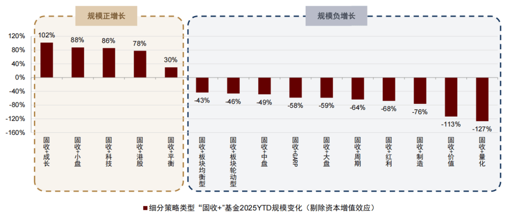 我们统计细分“固收+”策略类型的产品获得规模增长情况(剔除资本增值效应后,下文同),结果表明,细分策略产品之间的整体差异相对较大,2025年明显更为热门的“固收+成长”(+102%)、“固收+小盘”(+88%)、“固收+科技”(+86%)等赛道收获了明显的规模正增长。
