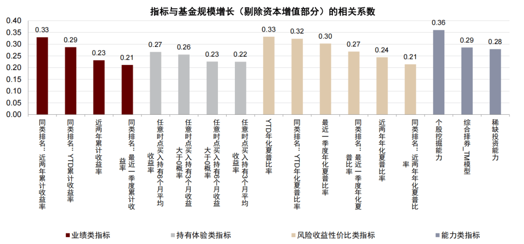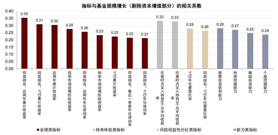 对于低波“固收+”基金而言,如果基金长期业绩排名突出,则有助于其规模增长。相关指标包括近两年收益率同类排名(相关系数0.35),以及YTD收益率同类排名(相关系数0.30)。