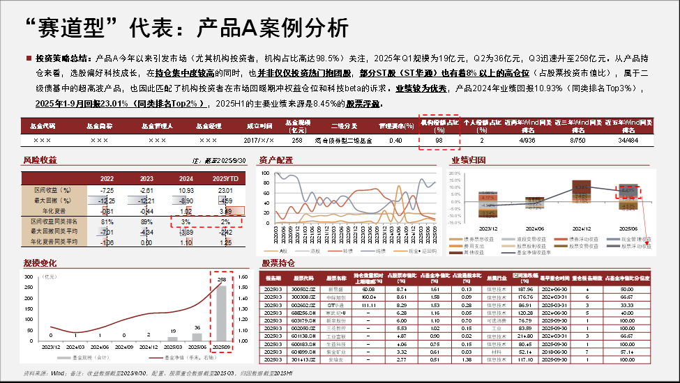 我们已经在此前的研究中阐述过,赛道型“固收+”基金或将在2026年持续受到追捧的主要逻辑。而诸如景顺长城基金、永赢基金也均是依靠赛道型产品布局和发展收获2025YTD“固收+”基金市场份额明显增长的“成功范例”,我们将其代表性案例产品的分析展示如下。