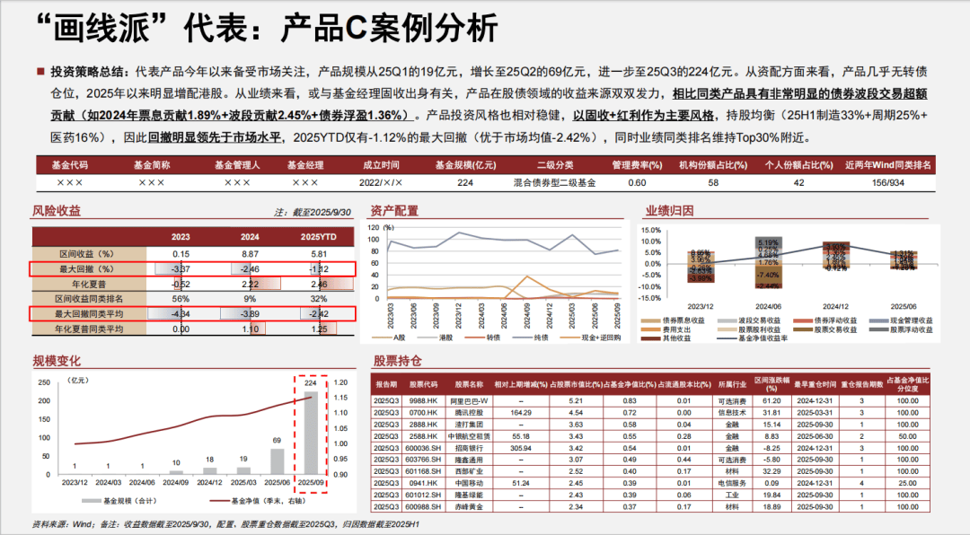 除此之外,所谓画线派“固收+”基金,也并非如直观感受一般,仅仅在震荡市中才具有吸引力。在权益市场行情明显火热的环境下,也同样具备个人投资者稳中求进的收益诉求、机构投资者的低换手底仓诉求等客户“基本盘”,因此始终具备增量资金流入潜力。我们也将2025YTD依靠较好持有体验获得明显资金流入的代表性案例产品分析结果展示如下。