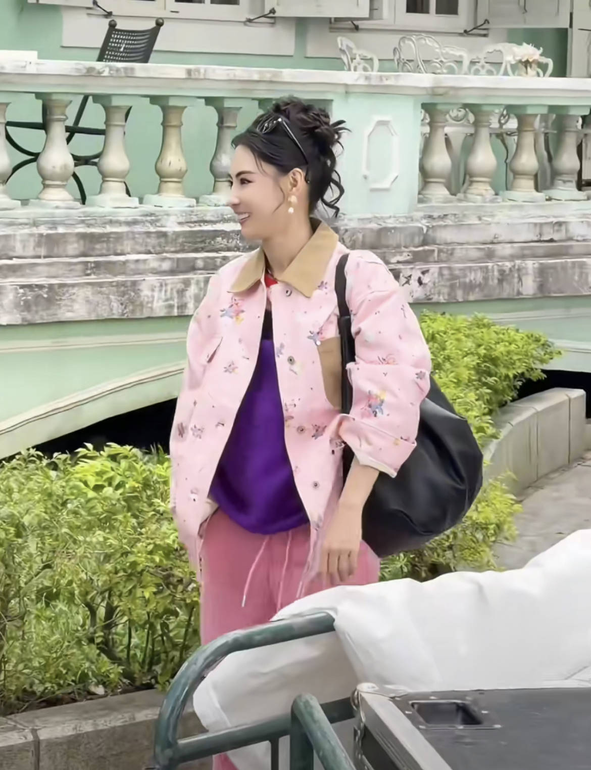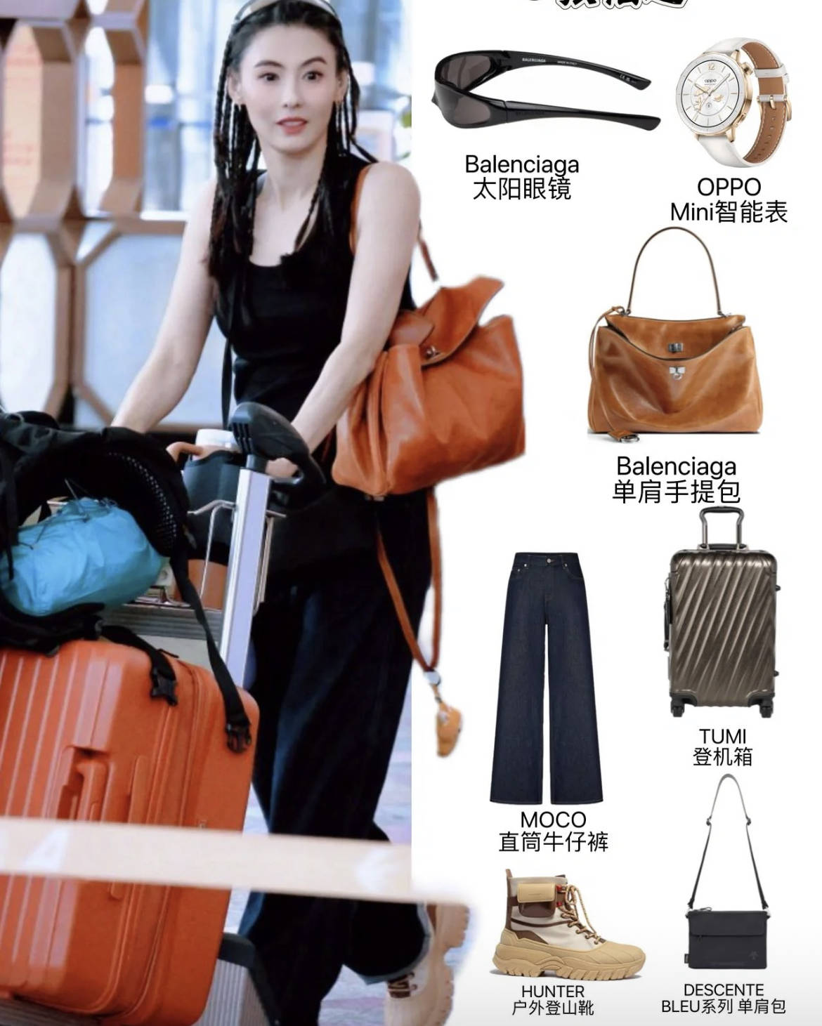 在《一路繁花2》节目的出发录制中,她身穿黑色无袖连体装利落又显瘦,脏辫造型又添几分酷感。焦糖色皮质大包与橙色行李箱做色彩呼应,黑色系穿搭靠配件点亮整体,休闲又舒适。