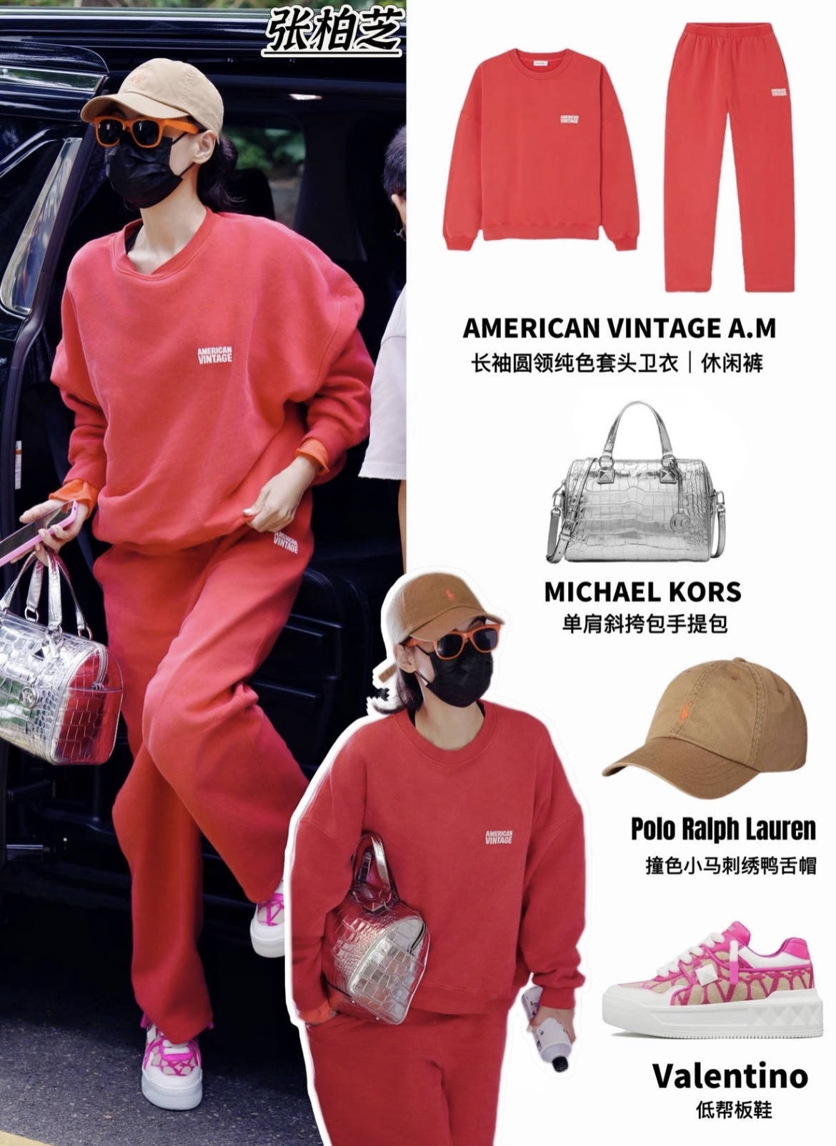 一身正红色American Vintage卫衣套装走休闲运动风,高饱和红色自带吸睛buff,宽松廓形弱化身材线条,慵懒又随性。卡其棒球帽+橙框墨镜做撞色点缀,银色亮面手拎包中和红色的厚重感,细节让整体配色更有层次。